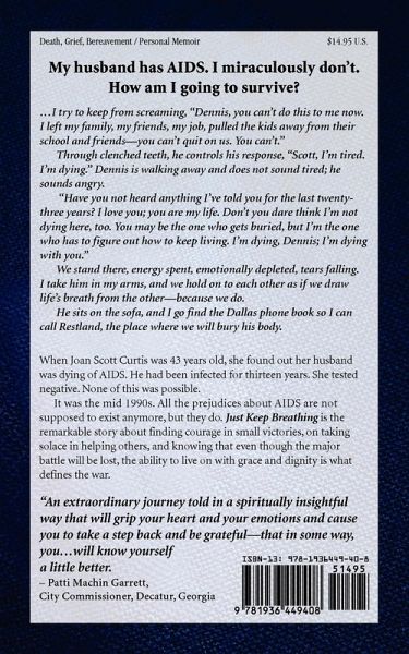 My husband has AIDS. I miraculously don't. How am I going to survive? ...I try to keep from screaming, "Dennis, you can't do this to me now. I left my family, my friends, my job, pulled the kids away from their school and friends-you can't quit on us. You can't." Through clenched teeth, he controls his response, "Scott, I'm tired. I'm dying." Dennis is walking away and does not sound tired; he sounds angry. "Have you not heard anything I've told you for the last twenty-three years? I love you; you are my life. Don't you dare think I'm not dying here, too. You may be the one who gets buried, but I'm the one who has to figure out how to keep living. I'm dying, Dennis; I'm dying with you." We stand there, energy spent, emotionally depleted, tears falling. I take him in my arms, and we hold on to each other as if we draw life's breath from the other-because we do. He sits on the sofa, and I go find the Dallas phone book so I can call Restland, the place where we will bury his body. When Joan Scott Curtis was 43 years old, she found out her husband was dying of AIDS. He had been infected for thirteen years. She tested negative. None of this was possible. It was the mid 1990s. All the prejudices about AIDS are not supposed to exist anymore, but they do. Just Keep Breathing is the remarkable story about finding courage in small victories, on taking solace in helping others, and knowing that even though the major battle will be lost, the ability to live on with grace and dignity is what defines the war. "An extraordinary journey told in a spiritually insightful way that will grip your heart and your emotions and cause you to take a step back and be grateful-that in some way, you...will know yourself a little better. Patti Machin Garrett, City Commissioner, Decatur, Georgia