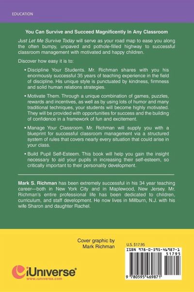You Can Survive and Succeed Magnificently In Any Classroom Just Let Me Survive Today will serve as your road map to ease you along the often bumpy, unpaved and pothole-filled highway to successful classroom management with motivated and happy children. Discover how easy it is to: Discipline Your Students. Mr. Richman shares with you his enormously successful 35 years of teaching experience in the field of discipline. His unique style is punctuated by kindness, firmness and solid human relations strategies. Motivate Them. Through a unique combination of games, puzzles, rewards and incentives, as well as by using lots of humor and many traditional techniques, your students will become highly motivated. They will be provided with opportunities for success and the building of confidence in a framework of fun and excitement. Manage Your Classroom. Mr. Richman will supply you with a blueprint for successful classroom management via a structured system of rules that covers nearly every situation that could arise in your class. Build Pupil Self-Esteem. This book will help you gain the insight necessary to aid your pupils in increasing their self-esteem, so critically important to their personality development.