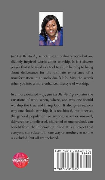 Just Let Me Worship is not just an ordinary book but are divinely inspired words about worship. It is a sincere prayer that it be used as a tool to aid in helping to bring about deliverance for the ultimate experience of a transformation in an individual's life. May the words usher you into a more enhanced lifestyle of worship. In a more detailed way, Just Let Me Worship explains the variations of who, when, where, and why one should worship the true and living God. It also gives reasons why one should worship. It is not biased, but it serves the general population, so anyone, saved or unsaved, delivered or undelivered, churched or unchurched, can benefit from the information inside. It is a project that everyone can relate to in one way or another, so no one is excluded, but all are included.
