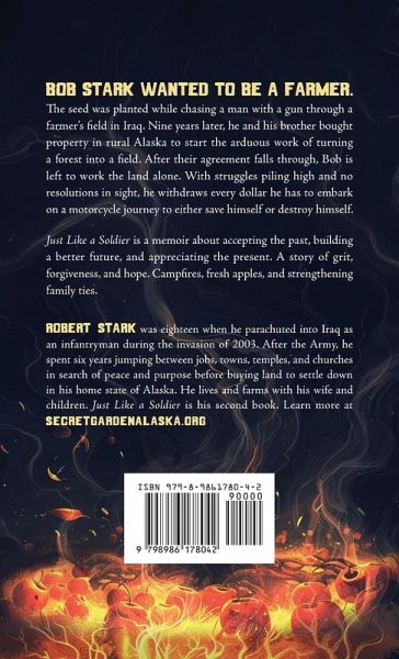 Bob Stark wanted to be a farmer. The seed was planted while chasing a man with a gun through a farmer's field in Iraq. Nine years later, he and his brother bought property in rural Alaska to start the arduous work of turning a forest into a field. After their agreement falls through, Bob is left to work the land alone. With struggles piling high and no resolutions in sight, he withdraws every dollar he has to embark on a motorcycle journey to either save himself or destroy himself. Just Like a Soldier is a memoir about accepting the past, building a better future, and appreciating the present. A story of grit, forgiveness, and hope. Campfires, fresh apples, and strengthening family ties.