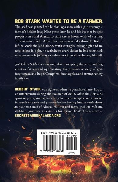 Bob Stark wanted to be a farmer. The seed was planted while chasing a man with a gun through a farmer's field in Iraq. Nine years later, he and his brother bought property in rural Alaska to start the arduous work of turning a forest into a field. After their agreement falls through, Bob is left to work the land alone. With struggles piling high and no resolutions in sight, he withdraws every dollar he has to embark on a motorcycle journey to either save himself or destroy himself. Just Like a Soldier is a memoir about accepting the past, building a better future, and appreciating the present. A story of grit, forgiveness, and hope. Campfires, fresh apples, and strengthening family ties.