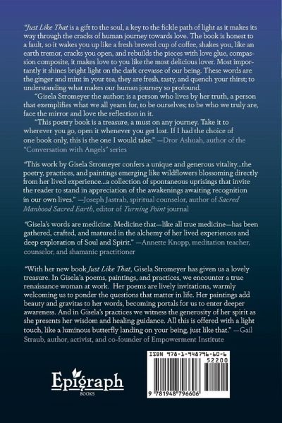 Shelf Unbound 2019 Best Indie Book Award Winner—Notable Indie "Just Like That is a gift to the soul, a key to the fickle path of light as it makes its way through the cracks of human journey towards love. The book is honest to a fault, so it wakes you up like a fresh brewed cup of coffee, shakes you, like an earth tremor, cracks you open, and rebuilds the pieces with love glue, compassion composite, it makes love to you like the most delicious lover. Most importantly it shines bright light on the dark crevasse of our being. These words are the ginger and mint in your tea, they are fresh, tasty, and quench your thirst; to understanding what makes our human journey so profound. "Gisela Stromeyer the author; is a person who lives by her truth, a person that exemplifies what we all yearn for, to be ourselves; to be who we truly are, face the mirror and love the reflection in it. "This poetry book is a treasure, a must on any journey. Take it to wherever you go, open it whenever you get lost. If I had the choice of one book only, this is the one I would take." —Dror Ashuah, author of the "Conversation with Angels" series "This work by Gisela Stromeyer confers a unique and generous vitality…the poetry, practices, and paintings emerging like wildflowers blossoming directly from her lived experience…a collection of spontaneous uprisings that invite the reader to stand in appreciation of the awakenings awaiting recognition in our own lives." —Joseph Jastrab, spiritual counselor, author of Sacred Manhood Sacred Earth, editor of Turning Point journal "Gisela’s words are medicine. Medicine that—like all true medicine—has been gathered, crafted, and matured in the alchemy of her lived experiences and deep exploration of Soul and Spirit." —Annette Knopp, meditation teacher, counselor, and shamanic practitioner "With her new book Just Like That, Gisela Stromeyer has given us a lovely treasure. In Gisela’a poems, paintings, and practices, we encounter a true renaissance woman at work. Her poems are lively invitations, warmly welcoming us to ponder the questions that matter in life. Her paintings add beauty and gravitas to her words, becoming portals for us to enter deeper awareness. And in Gisela’s practices we witness the generosity of her spirit as she presents her wisdom and healing guidance. All this is offered with a light touch, like a luminous butterfly landing on your being, just like that." —Gail Straub, author, activist, and co-founder of Empowerment Institute
