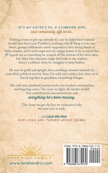 He's my sister's ex, a stubborn jerk, and completely off-limits. Getting a man to give up custody of a son he didn't know existed should have been easy. Trouble is, nothing with JP King is ever easy. Suave, grumpy billionaires aren't supposed to have strong hands or filthy mouths, and I never expected our snippy banter to be so much fun. JP regards me as something he scraped off the bottom of his dress shoe, but when this reluctant single dad looks at my nephew, there's a softness there he struggles to keep hidden. He may be gruff and uptight, but something simmers beneath his controlled, polished exterior. Sure, I'm wild and reckless, but when we're forced together as guardians, everything changes. His cold and calculated exterior melts into hushed conversations and lingering stares. The more we fight, the harder we fall. I'm scatterbrained, unconventional, and everything he's been missing. The closer we get, the less we understand why we were ever at odds. . . . until just like that our lives are turned upside down.