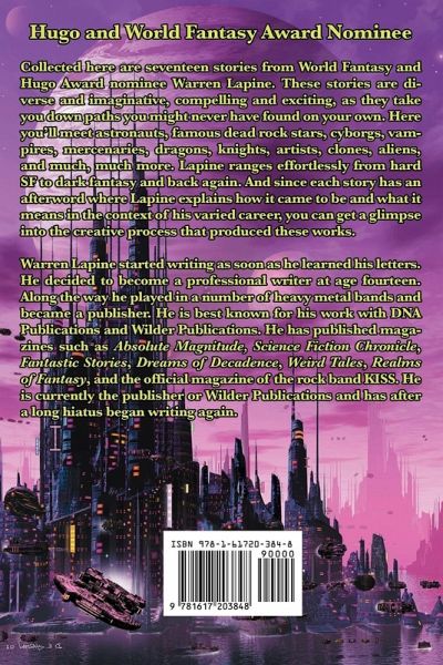 Collected here are seventeen stories from World Fantasy and Hugo Award nominee Warren Lapine. These stories are diverse and imaginative, compelling and exciting, as they take you down paths you might never have found on your own. Here you'll meet astronauts, famous dead rock stars, cyborgs, vampires, mercenaries, dragons, knights, artists, clones, aliens, and much, much more. Lapine ranges effortlessly from hard SF to dark fantasy and back again. And since each story has an afterword where Lapine explains how it came to be and what it means in the context of his varied career, you can get a glimpse into the creative process that produced these works. Warren Lapine started writing as soon as he learned his letters. He decided to become a professional writer at age fourteen. Along the way he played in a number of heavy metal bands and became a publisher. He is best known for his work with DNA Publications and Wilder Publications. He has published magazines such as Absolute Magnitude, Science Fiction Chronicle, Fantastic Stories, Dreams of Decadence, Weird Tales, Realms of Fantasy, and the official magazine of the rock band KISS. He is currently the publisher or Wilder Publications and has after a long hiatus began writing again.