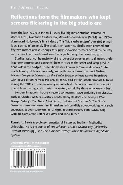 From the late 1930s to the mid-1950s, five big movie studios-Paramount, Warner Bros., Twentieth Century-Fox, Metro-Goldwyn-Mayer (MGM), and RKO-dominated Hollywood's film industry. This "big studio system" operated primarily as a series of assembly-line production factories. Ideally, each churned out fifty-two movies a year, enough to supply showcase theaters across the country with a new lineup each week-with profit being the overriding goal. Of this era, veteran screenwriter Julius Epstein (Casablanca) said: "It was not called the motion picture industry for nothing. [It] was like working at belts in a factory." Studios assigned the majority of the lower-tier screenplays to directors under long-term contract and expected them to stick to the script and keep productions within the budget. These filmmakers, known as "house directors," often made films quickly, inexpensively, and with limited resources. Just Making Movies: Company Directors on the Studio System collects twelve interviews with house directors from this era, all conducted by the author during the 1980s. These previously unpublished interviews provide a clear picture of how the big studio system operated, as told by those who knew it best. Despite limitations, house directors sometimes made enduring film classics, such as Charles Walters's Easter Parade, Henry Koster's The Bishop's Wife, George Sidney's The Three Musketeers, and Vincent Sherman's The Hasty Heart. In these interviews the filmmakers talk candidly about working with such superstars as Joan Crawford, Errol Flynn, Richard Burton, Bette Davis, Judy Garland, Cary Grant, Esther Williams, and Lana Turner.