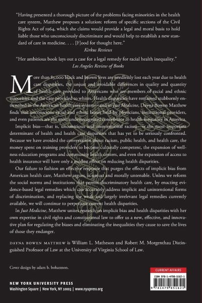 "Over 84,000 black and brown lives are needlessly lost each year due to health disparities, the unfair, unjust, and avoidable differences between the quality and quantity of health care provided to Americans who are members of racial and ethnic minorities and care provided to whites. Health disparities have remained stubbornly entrenched in the American health care system--and in Just Medicine, Dayna Bowen Matthew finds that they principally arise from unconscious racial and ethnic biases held by physicians, institutional providers, and their patients. Implicit bias is the single most important determinant of health and health care disparities. Because we have missed this fact, the money we spend on training providers to become culturally competent, expanding wellness education programs and community health centers, and even expanding access to health insurance will have only a modest effect on reducing health disparities. We will continue to utterly fail in the effort to eradicate health disparities unless we enact strong, evidence-based legal remedies that accurately address implicit and unintentional forms of discrimination, to replace the weak, tepid, and largely irrelevant legal remedies currently available. Our continued failure to fashion an effective response that purges the effects of implicit bias from American health care, Matthew argues, is unjust and morally untenable. In this book, she unites medical, neuroscience, psychology, and sociology research on implicit bias and health disparities with her own expertise in civil rights and constitutional law. Just Medicine offers us a new, effective, and innovative plan to regulate implicit biases and eliminate the inequalities they cause, and to save the lives they endanger." --