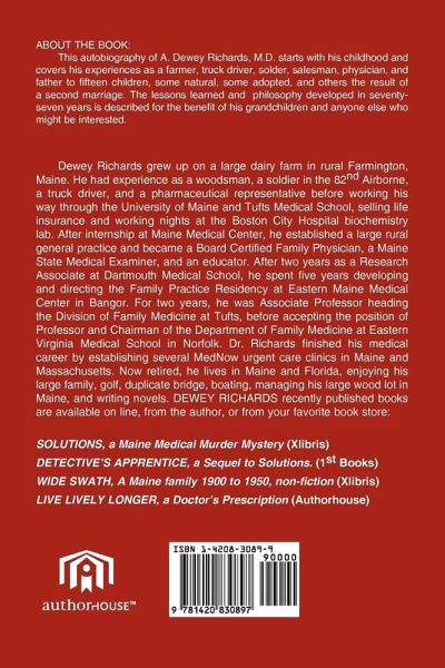 This autobiography of A. Dewey Richards, M.D. starts with his childhood and covers his experiences as a farmer, truck driver, solder, salesman, physician, and father to fifteen children, some natural, some adopted, and others the result of a second marriage. The lessons learned and philosophy developed in seventy-seven years is described for the benefit of his grandchildren and anyone else who might be interested.