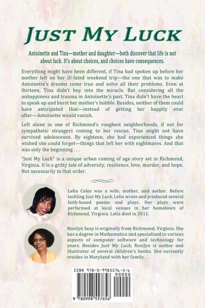 "Just My Luck" is a unique urban coming of age story set in Richmond, Virginia. It is a gritty tale of adversity, resilience, love, murder, and hope. Not necessarily in that order. Everything might have been different, if Tina had spoken up before her mother - who should've learned from previous experience not to trust too good to be true men - left on her ill-fated weekend trip. Even at thirteen, Tina didn't buy into the miracle that the sleazy Mr. Franks would make all their dreams come true, and would be the solution to all their problems. But considering all the unhappiness and trauma in her mother's past-including the circumstances of her daughter's birth-Tina didn't have the heart to speak up and burst Antoinette's bubble. Besides, neither of them could have anticipated that, instead of getting her happily-ever-after, Antoinette would disappear. Abandoned in one of Richmond's roughest neighborhoods, by eighteen, Tina experiences nightmarish things she wishes she could forget. If not for sympathetic strangers coming to her rescue, she might not have survived adolescence. Then, just as she feels she can finally put all the drama of her past behind her, things again get complicated. She is faced with the murder of a new friend, insecurities of a new love, and the real possibility that she might become the target of some very dangerous people.
