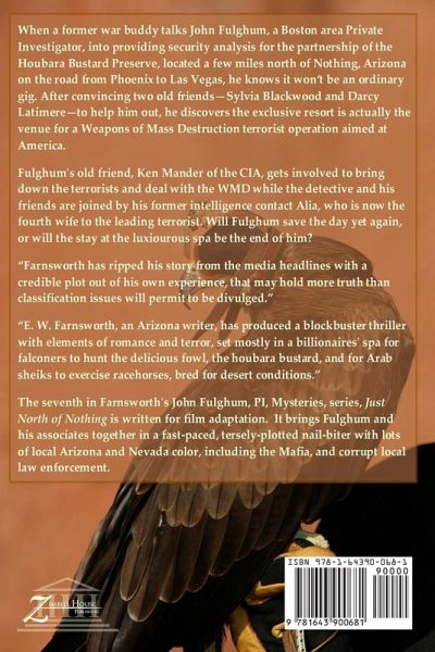 When a former war buddy talks John Fulghum, a Boston area Private Investigator, into providing security analysis for the partnership of the Houbara Bustard Preserve, located a few miles north of Nothing, Arizona on the road from Phoenix to Las Vegas, he knows it won't be an ordinary gig. After convincing two old friends-Sylvia Blackwood and Darcy Latimere-to help him out, he discovers the exclusive resort is actually the venue for a Weapons of Mass Destruction terrorist operation aimed at America. Fulghum's old friend, Ken Mander of the CIA, gets involved to bring down the terrorists and deal with the WMD while the detective and his friends are joined by his former intelligence contact Alia, who is now the fourth wife to the leading terrorist. Will Fulghum save the day yet again, or will the stay at the luxurious spa be the end of him? "Farnsworth has ripped his story from the media headlines with a credible plot out of his own experience, that may hold more truth than classification issues will permit to be divulged." "E. W. Farnsworth, an Arizona writer, has produced a blockbuster thriller with elements of romance and terror, set mostly in a billionaires' spa for falconers to hunt the delicious fowl, the houbara bustard, and for Arab sheiks to exercise racehorses, bred for desert conditions." The seventh in Farnsworth's John Fulghum, PI, Mysteries, series, Just North of Nothing is written for film adaptation. It brings Fulghum and his associates together in a fast-paced, tersely-plotted nail-biter with lots of local Arizona and Nevada color, including the Mafia, and corrupt local law enforcement.