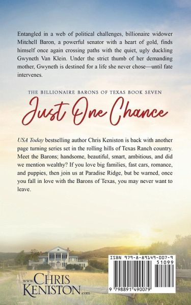 Entangled in a web of political challenges, billionaire widower Mitchell Baron, a powerful senator with a heart of gold, finds himself once again crossing paths with the quiet, ugly duckling Gwyneth Van Klein. Under the strict thumb of her demanding mother, Gwyneth is destined for a life she never chose-until fate intervenes. Dive into this Cinderella tale of unexpected transformation and enduring love in this must-read installment set in the rolling hills of Texas ranch country with all the fun and shenanigans you've come to love and expect from USA Today Bestselling author Chris Keniston. USA Today bestselling author Chris Keniston is back with another page turning series set in the rolling hills of Texas Ranch country. Meet the Barons; handsome, beautiful, smart, ambitious, and did we mention wealthy? If you love big families, fast cars, romance, and puppies, then join us at Paradise Ridge, but be warned, once you fall in love with the Barons of Texas, you may never want to leave. More From the Billionaire Barons of Texas: Just One Date Just One Spark Just One Dance Just One Take Just One Taste Just One Shot Just One Chance Just One Mistake