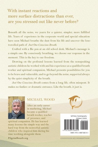 With instant reactions and more surface distractions than ever, are you stressed out like never before? Beneath all the noise, we yearn for a quieter, simpler, more fulfilled life. Years of experience in the corporate world and special education have seen Michael breathe the dust from his life and uncover the less travelled path of Just One Conscious Breath. Crafted with a Bic pen at an old school desk, Michael's message is a simple one: By consciously breathing, we choose our response in the moment. This is the key to our freedom. Drawing on the profound lessons learned from the nonspeaking autistic children he worked with and his experience as a qualified breath worker and spiritual companion, Michael presents possibilities for you to be brave and vulnerable, and to go beyond the noise, supported always by the quiet simplicity of the breath. Just One Conscious Breath comes from a long life, often misspent. It makes no fanfare or dramatic entrance. Like the breath, it just is. About Michael Wood After an early career in marketing, Michael became a qualified breath worker, teacher of presence, and spiritual companion. He has learned many lessons the simple way and the hard way from the nonspeaking autistic children who inspired him during his time working alongside them.