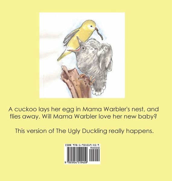 Cuckoos Lay Eggs in Warbler Nests and fly away. Should Mama Warbler raise the cuckoo baby as her own? Inspired by The Ugly Duckling by Hans Christian Anderson. This story shows mutual benefit to both warblers and cuckoos when a cuckoo lays an egg in a warbler's nest. Cuckoo babies eat six times as much as warbler babies. Soon they are bigger than their warbler mamas. They are stinky and hungry and huge. Will Mama Warbler love her new baby?