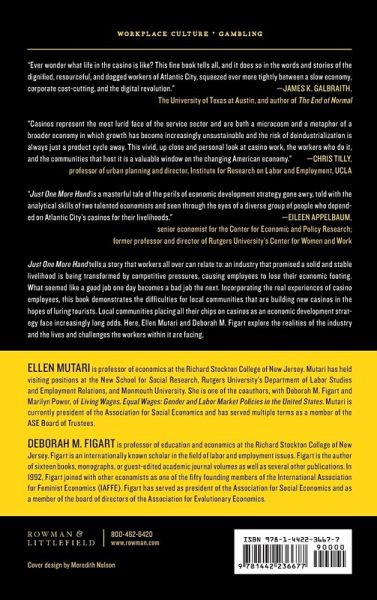 Just One More Hand tells a story that workers all over can relate to: an industry that promised a solid and stable livelihood is being transformed by competitive pressures, causing employees to lose their economic footing. What seemed like a good job one day becomes a bad job the next. Incorporating the real experiences of casino employees, the book demonstrates the difficulties for local communities that are building new casinos in the hopes of luring tourists. Local communities placing all their chips on casinos as an economic development strategy face increasingly long odds. Life stories of individual workers in Atlantic City are explored in the context of the history of the city and the now-global gaming industry. With more and more casinos competing for customers, employees are feeling the brunt of cost-cutting measures, including the wholesale closure of some casinos. While long-time employees are fighting against concessions and wage stagnation, younger workers juggle multiple part-time and seasonal jobs at several casinos. Policy makers hoping to offset these trends are trying to rebrand Atlantic City for a younger, hipper, and more well-to-do clientele using public-private partnerships. Unfortunately, scant attention is being paid to the core issue in economic development-the need for sustainable livelihoods and meaningful work. Here, Ellen Mutari and Deborah Figart explore the realities of the industry and the lives and challenges the workers within it are facing.