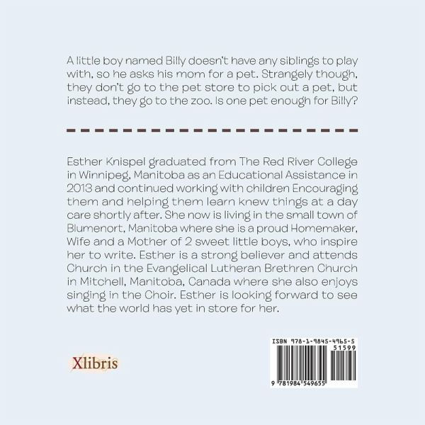About the Author Esther Knispel graduated from The Red River College in Winnipeg, Manitoba as an Educational Assistance in 2013 and continued working with children Encouraging them and helping them learn knew things at a day care shortly after. She now is living in the small town of Blumenort, Manitoba where she is a proud Homemaker, Wife and a Mother of 2 sweet little boys, who inspire her to write. Esther is a strong believer and attends Church in the Evangelical Lutheran Brethren Church in Mitchell, Manitoba, Canada where she also enjoys singing in the Choir. Esther is looking forward to see what the world has yet in store for her.