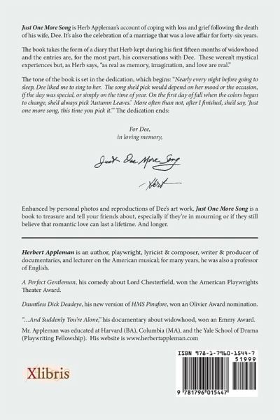 Just One More Song is Herb Appleman's account of coping with loss and grief following the death of his wife, Dee. It's also the celebration of a marriage that was a love affair for forty-six years. The book takes the form of a diary that Herb kept during his first fifteen months of widowhood, and the entries are, for the most part, his conversations with Dee. These weren't mystical experiences but, as Herb says, "as real as memory, imagination, and love are real." They came about because he couldn't sleep. Even sleeping pills didn't help. Nothing did, until one night, when he remembered a scene from the movie Sleepless in Seattle. It was a scene in which Tom Hanks played a character who'd been recently widowed and was having trouble sleeping. Out of the blue, he imagined his dead wife sitting on the other end of the sofa, talking to him, and he felt comforted. Herb thought he'd give it a try and imagined talking to Dee. It worked. From then on, knowing he could talk to her at the end of the day gave him something to look forward to, and after they talked, he found it easier to sleep. Their conversations were triggered by things that happened on a particular day but ranged, as conversations often do, over the whole of their lives. The tone of the book is set in the dedication, which begins, "Nearly every night before going to sleep, Dee liked me to sing to her. The song she'd pick would depend on her mood or the occasion, if the day was special, or simply on the time of year. On the first day of fall, when the colors began to change, she'd always pick 'Autumn Leaves.' More often than not, after I finished, she'd say, 'Just one more song. This time you pick it.'" The dedication ends: "For Dee, in loving memory, just one more song." Just One More Song is enhanced by personal photos and reproductions of Dee's artwork; it's a book to treasure and tell your friends about, especially if they're in mourning or if they still believe that romantic love can last a lifetime. And longer.