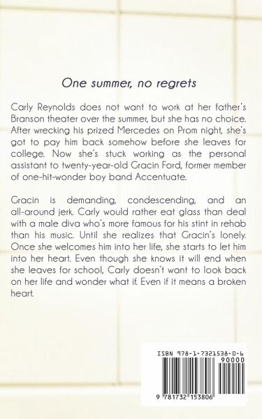 One summer, no regrets Carly Reynolds does not want to work at her father's Branson theater over the summer, but she has no choice. After wrecking his prized Mercedes on Prom night, she's got to pay him back somehow before she leaves for college. Now she's stuck working as the personal assistant to twenty-year-old Gracin Ford, former member of one-hit-wonder boy band Accentuate. Gracin is demanding, condescending, and an all-around jerk. Carly would rather eat glass than deal with a male diva who's more famous for his stint in rehab than his music. Until she realizes that Gracin's lonely. Once she welcomes him into her life, she starts to let him into her heart. Even though she knows it will end when she leaves for school, Carly doesn't want to look back on her life and wonder what if. Even if it means a broken heart.