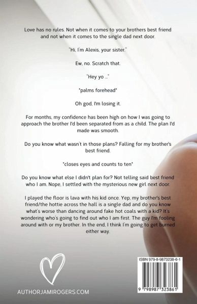 Love has no rules. Not when it comes to your brothers best friend and not when it comes to the single dad next door. "Hi, I'm Alexis, your sister." Ew, no. Scratch that. "Hey yo ..." *palms forehead* Oh god, I'm losing it. For months, my confidence has been high on how I was going to approach the brother I'd been separated from as a child. The plan I'd made was smooth. Do you know what wasn't in those plans? Falling for my brother's best friend. *closes eyes and counts to ten* Do you know what else I didn't plan for? Not telling said best friend who I am. Nope, I settled with the mysterious new girl next door. I played the floor is lava with his kid once. Yep, my brother's best friend/the hottie across the hall is a single dad and do you know what's worse than dancing around fake hot coals with a kid? It's wondering who's going to find out who I am first. The guy I'm fooling around with or my brother. In the end, I think I'm going to get burned either way.