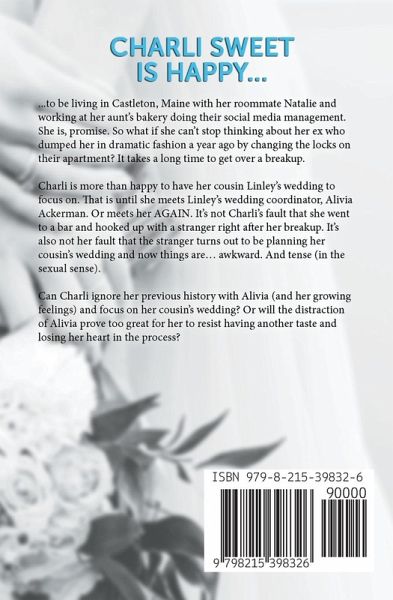 Charli Sweet is happy to be living in Castleton, Maine with her roommate Natalie and working at her aunt's bakery doing their social media management. She is, promise. So what if she can't stop thinking about her ex who dumped her in dramatic fashion a year ago by changing the locks on their apartment? It takes a long time to get over a breakup. Charli is more than happy to have her cousin Linley's wedding to focus on. That is until she meets Linley's wedding coordinator, Alivia Ackerman. Or meets her AGAIN. It's not Charli's fault that she went to a bar and hooked up with a stranger right after her breakup. It's also not her fault that the stranger turns out to be planning her cousin's wedding and now things are… awkward. And tense (in the sexual sense). Can Charli ignore her previous history with Alivia (and her growing feelings) and focus on her cousin's wedding? Or will the distraction of Alivia prove too great for her to resist having another taste and losing her heart in the process?