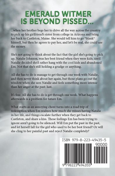 Emerald Witmer is beyond pissed when her brother begs her to drive all the way across the country to pick up his girlfriend's sister from college in Arizona and bring her back to Castleton, Maine. She would tell him to go *blank* himself, but then he agrees to pay her, and let's be real, she could use the money. She's not going to think about the fact that the girl she's going to pick up, Natalie Johnson, was her best friend when they were kids, until Natalie decided she'd rather hang with the cool kids and abandoned Em. Not that she's still holding a grudge or anything. All she has to do is manage to get through one week with Natalie, and then never think about her again, but those plans go out the window when she sees Natalie and feels something more intense than her anger at the past: lust. It's fine. All she has to do is get through one week. What happens afterwards is a problem for future Em. What starts as an annoying chore turns into a road trip of redemption when Em realizes how much she misses having Natalie in her life, and things escalate further when they get back to Castleton, and share a kiss. Those feelings Em has been trying to ignore aren't going to be silenced. Will Em put the past in the past, and let herself fall for the girl who used to be her best friend? Or will she cling to her painful past and reject Natalie completely?