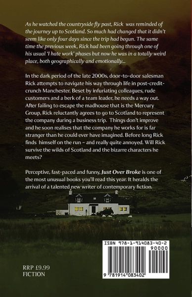 As he watched the countryside fly past, Rick was reminded of the journey up to Scotland. So much had changed that it didn't seem like only four days since the trip had begun. The same time the previous week, Rick had been going through one of his usual 'I hate work' phases but now he was in a totally weird place, both geographically and emotionally... In the dark period of the late 2000s, door-to-door salesman Rick attempts to navigate his way through life in post-creditcrunch Manchester. Beset by infuriating colleagues, rude customers and a berk of a team leader, he needs a way out. After failing to escape the madhouse that is the Mercury Group, Rick reluctantly agrees to go to Scotland to represent the company during a business trip. Things don't improve and he soon realises that the company he works for is far stranger than he could ever have imagined. Before long Rick finds himself on the run - and really quite annoyed. Will Rick survive the wilds of Scotland and the bizarre characters he meets? Perceptive, fast-paced and funny, Just Over Broke is one of the most unusual books you'll read this year. It heralds the arrival of a talented new writer of contemporary fiction.