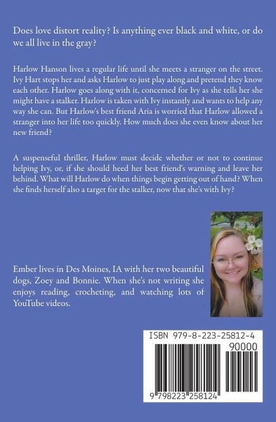Does love distort reality? Is anything ever black and white, or do we all live in the gray? Harlow Hanson lives a regular life until she meets a stranger on the street. Ivy Hart stops her and asks Harlow to just play along and pretend they know each other. Harlow goes along with it, concerned for Ivy as she tells her she might have a stalker. Harlow is taken with Ivy instantly and wants to help any way she can. But Harlow's best friend Aria is worried that Harlow allowed a stranger into her life too quickly. How much does she even know about her new friend? A suspenseful thriller, Harlow must decide for herself whether or not to continue helping Ivy, or, if she should heed her best friend's warning and leave her behind. What will Harlow do when things begin getting out of hand? When she finds herself also a target for the stalker, now that she's with Ivy?