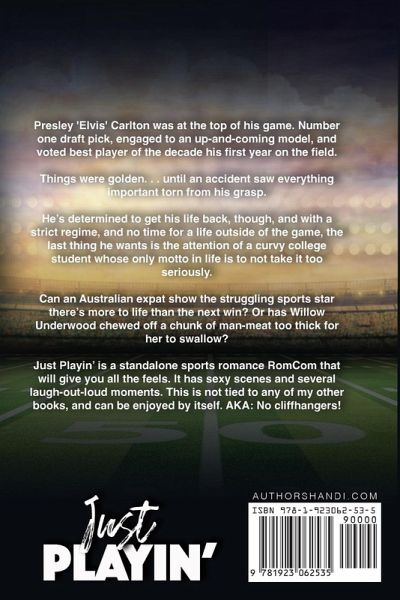 Presley 'Elvis' Carlton was at the top of his game. Number one draft pick, engaged to an up-and-coming model, and voted best player of the decade his first year on the field. Things were golden. . . until an accident saw everything important torn from his grasp. He's determined to get his life back, though, and with a strict regime, and no time for a life outside of the game, the last thing he wants is the attention of a curvy college student whose only motto in life is to not take it too seriously. Can an Australian expat show the struggling sports star there's more to life than the next win? Or has Willow Underwood chewed off a chunk of man-meat too thick for her to swallow? Just Playin' is a standalone sports romance RomCom that will give you all the feels. It has sexy scenes and several laugh-out-loud moments. This is not tied to any of my other books, and can be enjoyed by itself. AKA: No cliffhangers! * For TWs please visit the author's website.