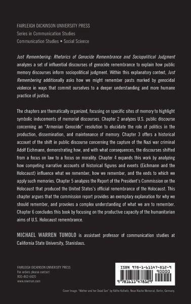 Just Remembering: Rhetorics of Genocide Remembrance and Sociopolitical Judgment analyzes a set of influential discourses of genocide remembrance to explain how public memory discourses inform sociopolitical judgment. Within this explanatory context, Just Remembering additionally asks how we might remember pasts marked by genocidal violence in ways that commit ourselves to a deeper understanding and more humane practice of justice. The chapters are thematically organized, focusing on specific sites of memory to highlight symbolic inducements of memorial discourses. Chapter 2 analyzes U.S. public discourse concerning an "Armenian Genocide" resolution to elucidate the role of politics in the production, dissemination, and maintenance of memory. Chapter 3 offers a historical account of the shift in public discourse concerning the capture of the Nazi war criminal Adolf Eichmann, demonstrating how and with what consequences the discourses shifted from a focus on law to a focus on morality. Chapter 4 expands this work by analyzing how competing narrative accounts of historical figures and events (Eichmann and the Holocaust) influence what we remember, how we remember, and the ends to which we apply such memories. Chapter 5 analyzes the Report of the President's Commission on the Holocaust that produced the United States' official remembrance of the Holocaust. This chapter argues that the Commission Report provides an exemplary explanation for why we should remember and provokes a complex understanding of what we are to remember. Chapter 6 concludes the book by focusing on the productive capacity of the humanitarian aims of U.S. Holocaust remembrance.