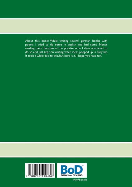 About this book: While writing several german books with poems I tried to do some in english and had some friends reading them. Because of the positive echo I then continued to do so and just kept on writing when ideas popped up in daily life. It took a while due to this, but here it is. I hope you have fun.