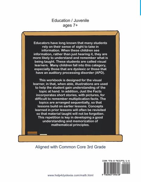 Just the Facts! Workbook #3 is perfect for students who have mastered addition and subtraction and are ready to learn multiplication, division, and many other math related topics that include these operations. This workbook, 8.5" x 11", has 45 lessons (247 pages) that, like our reading programs, easily walks you through teaching your student math, it's cumulative with repetition. It also utilizes pictures whenever possible to illustrate a concept. Each lesson is done with the student, side-by-side, followed by 1 to 3 pages of independent work. What makes this math curriculum different than others is that it repeats older material, so concepts are not forgotten. It is also different in that it is designed specifically for visual learners, utilizing many visual aids. This curriculum is in-line with common core for third grade; the grade in which teachers and parents often start to notice their students struggle with math, especially the students who have struggled with reading and/or may have memory difficulties.