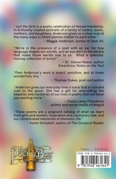 A gardener tends her vegetables and flowers while devising a way to manage her burgeoning chipmunk problem. A daughter pens a letter to her dead father. Jesus saunters into hot yoga and dazzles the assembled practitioners. Three sisters play on their swing set in the middle of the night. In these-and other-poems from Just the Girls: A Kaleidoscope of Butterflies; A Drift of Honeybees, women support, cheer, challenge, and, ultimately, sustain each other. Just the Girls celebrates women and what it means to be connected to the female whole. Advance Praise: "Just the Girls is a poetic celebration of female friendship. In brilliantly created portraits of a family of sisters, aunts, mothers, and daughters, Anderson gives us a close look at the many ways in which women matter to each other."~ Maggie Anderson, author of Dear All, "We're in the presence of a poet with an ear for how language shapes our worlds, and an eye alert to the details that make those worlds real to us. What a splendid, moving collection of lyrics!"~ Dr. Steven Reese, authorExcentrica: Notes on the Text "Pam Anderson's work is smart, sensitive, and at times wonderfully wry."~ Thomas Dukes, poet and author "Anderson gives our everyday lives a voice that is rich and cuts to the quick. She has a gift for articulating the beauties and mysteries of our lives in poetry that will leave you wanting more."~ Diane Laney Fitzpatrick, author and social media strategist "These poems are a poignant catalog of what we learn from girls and women, inspiration and cautionary tale, and our complicated memories of domestic life."~ Karen Schubert, author of The Compost Reader