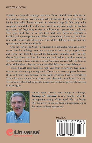 English as a Second Language instructor Trevor McCall lives with his cat in a studio apartment on the north side of Chicago. It's not a bad life but it's far from what Trevor pictured for himself at age 38. Not only is he struggling financially, he's also alone. And having been single for the last four years, he's beginning to fear it will become a permanent condition. Nice guys finish last, or so he's been told, and Trevor is definitely a kindhearted, contemplative soul. When not teaching, Trevor tries to fill his time with various cultural pursuits. And while fulfilling, he lacks that one special person to share it all with. One day Trevor and Scott-a musician he's befriended who has recently moved into his building-run into a stranger at their local pet supply store and Trevor can't keep his eyes off the handsome somewhat older man. By chance Scott later runs into the same man and decides to make contact on Trevor's behalf. It turns out he's a Greek-American named Nick who lives in their neighborhood. And he owns a beautiful Shiba Inu named Jefferson. Trevor himself spots Nick one night and from somewhere deep inside musters up the courage to approach. There is an instant rapport between them and soon they become romantically involved. Nick is everything Trevor has ever wanted in a partner, and although commitment is scary, Trevor knows that Nick is just the nudge he's needed to get his life moving forward again.