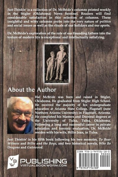 Just Thinkin' is a collection of Dr. McBride's columns printed weekly in the Stigler (Oklahoma) News Sentinel. Readers will find considerable satisfaction in this selection of columns. These insightful and witty columns probe into the very nature of politics and social issues as well as the rituals of our holidays and our sports. Dr. McBride's exploration of the role of our founding fathers into the texture of modern life is exceptional and intellectually satisfying.