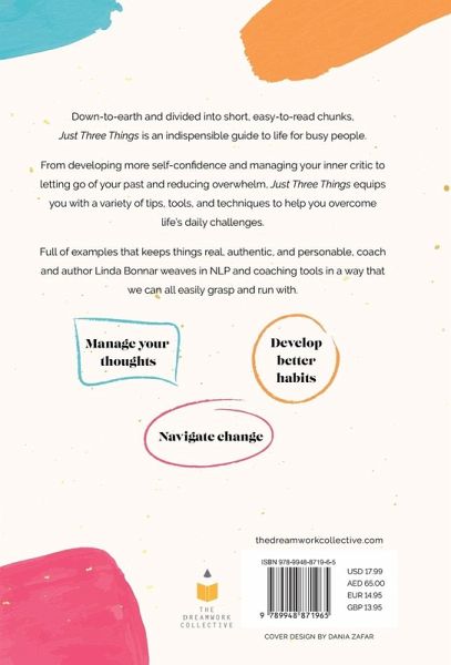 Down-to-earth and divided into short easy-to-read chunks, Just Three Things is an indispensable guide to life for busy people. From developing more self-confidence and managing your inner critic to letting go of your past and reducing overwhelm, Just Three Things equips you with a variety of tips, tools and techniques to help you overcome life's daily challenges. Full of examples that keeps things real, authentic and personable, coach and author Linda Bonnar weaves in NLP and coaching tools in a way that we can all easily grasp and run with to you help you: * Manage your thoughts * Develop better habits * Navigate change ... to bring about positive transformation with bite-sized actions. "I wrote this book because I know what it's like to want to make changes-big changes. I know what it's like to feel stuck, to feel frustrated with the way things are and completely lost as to how to turn them around. I know how scary change can be (What if I fail?) and how overwhelming it can be too (I don't even know where to start!). It's no wonder we don't welcome change with open arms. But I also know how incredible change can be. Despite the fear, the pain, and all the other discomfort change can bring, what an absolutely amazing feeling it is to look back and see how far you've come." -- Linda Bonnar This book is designed to make the process of change more manageable for you. Inside, you'll find a whole range of coaching tips, techniques, and strategies to help you successfully overcome the challenges you're facing and move forward confidently with your life.