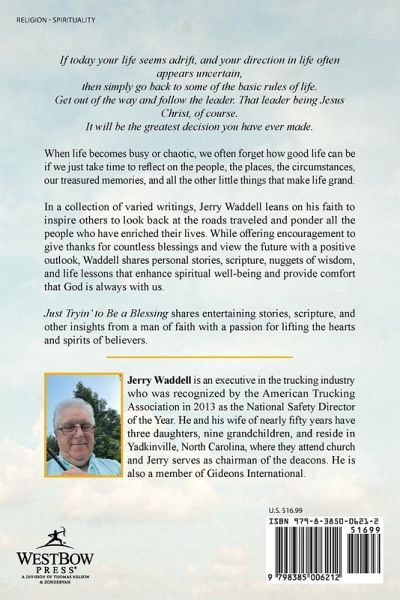 If today your life seems adrift, and your direction in life often appears uncertain, then simply go back to some of the basic rules of life. Get out of the way and follow the leader. That leader being Jesus Christ, of course. It will be the greatest decision you have ever made. When life becomes busy or chaotic, we often forget how good life can be if we just take time to reflect on the people, the places, the circumstances, our treasured memories, and all the other little things that make life grand. In a collection of varied writings, Jerry Waddell leans on his faith to inspire others to look back at the roads traveled and ponder all the people who have enriched their lives. While offering encouragement to give thanks for countless blessings and view the future with a positive outlook, Waddell shares personal stories, scripture, nuggets of wisdom, and life lessons that enhance spiritual well-being and provide comfort that God is always with us. Just Tryin' to Be a Blessing shares entertaining stories, scripture, and other insights from a man of faith with a passion for lifting the hearts and spirits of believers.