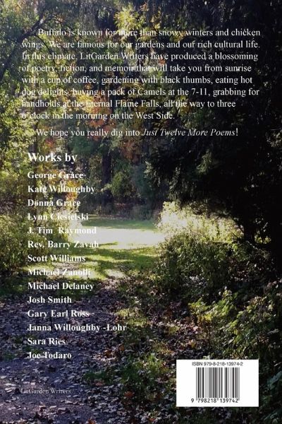 Buffalo is known for more than snowy winters and chicken wings. We are famous for our gardens and our rich cultural life. In this climate, LitGarden Writers have produced a blossoming of poetry, fiction, and memoir that will take you from sunrise with a cup of coffee, gardening with black thumbs, eating hot dog delights, buying a pack of Camels at the 7-11, grabbing for handholds at the Eternal Flame Falls, all the way to three o'clock in the morning on the West Side. Works by George Grace, Kate Willoughby, Donna Grace, Lynn Ciesielski, J. Tim Raymond, Rev. Barry Zavah, Scott Williams, Michael Zanolli, Michael Delaney, Josh Smith, Gary Earl Ross, Janna Willoughby -Lohr, Sara Ries, and Joe Todaro.