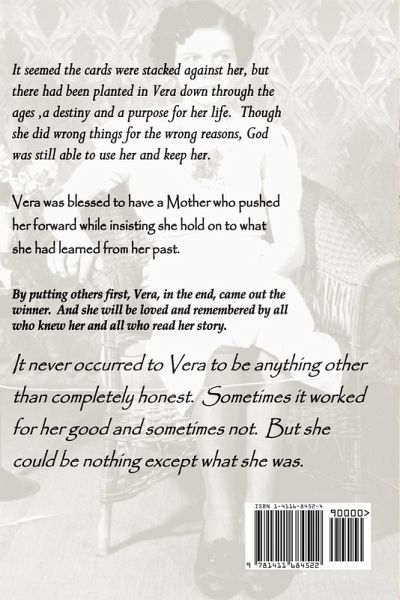 It seemed the cards were stacked against her, but there had been planted in Vera down through the ages, a destiny and a purpose for her life. Though she did wrong things for the wrong reasons, God was still able to use her and keep her. Vera was blessed to have a Mother who pushed her forward while insisting she hold on to what she had learned from her past. By putting others first, Vera, in the end, came out the winner. And she will be loved and remembered by all who knew her and all who read her story. It never occurred to Vera to be anything other than completely honest. Sometimes it worked for her good and sometimes not. But she could be nothing except what she was.