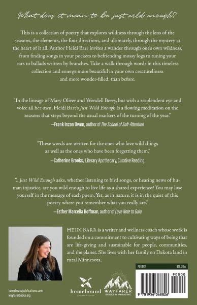 What does it mean to be just wild enough? This is a collection of poetry that explores wildness through the lens of the seasons, the elements, the four directions, and ultimately, through the mystery at the heart of it all. Author Heidi Barr invites a wander through one's own wildness, from finding songs in your pockets to befriending mossy logs to tuning your ears to ballads written by branches. Take a walk through words in this timeless collection and emerge more beautiful in your own creatureliness and more wonder-filled, than before.