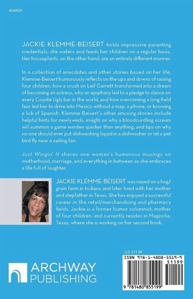 Jackie Klemme-Beisert holds impressive parenting credentials: she waters and feeds her children on a regular basis. Her houseplants, on the other hand, are an entirely different manner. In a collection of anecdotes and other stories based on her life, Klemme-Beisert humorously reflects on the ups and downs of raising four children, how a crush on Leif Garrett transformed into a dream of becoming an actress, why an epiphany led to a pledge to dance on every Coyote Ugly bar in the world, and how overcoming a long-held fear led her to drive into Mexico without a map, a phone, or knowing a lick of Spanish. Klemme-Beisert’s other amusing stories include helpful hints for newlyweds, insight on why a bloodcurdling scream will summon a game warden quicker than anything, and tips on why no one should ever put dishwashing liquid in a dishwasher or let a pet bird fly near a ceiling fan. Just Wingin’ It shares one woman’s humorous musings on motherhood, marriage, and everything in between as she embraces a life full of laughter.