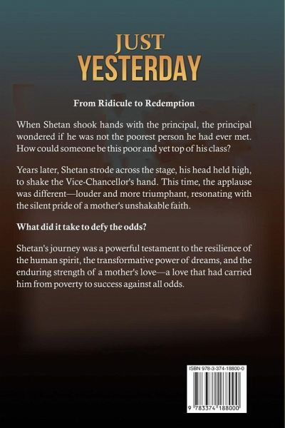 "Just Yesterday" is a captivating narrative that takes readers on a journey through the intricate world of Shetan. Poverty and fate intertwine to shape his existence, and as Shetan stands on the brink of a monumental triumph, a ceremony unfolds, revealing a tapestry woven with threads of pride, gratitude, and unyielding perseverance. Through Shetan's enigmatic journey, the narrative explores the profound impact of perseverance and faith on individuals, resonating with readers who dare to pursue their dreams despite insurmountable challenges. Against a backdrop of adversity, the transformative power of a mother's determination takes centre stage, illustrating how her unwavering vision can shape a child's destiny. From a young boy on the verge of stardom to a distinguished scholar, Shetan's transformation serves as a testament to the resilience inherent within us all. With each turn of the page, "Just Yesterday" promises to captivate and inspire, inviting readers to delve into the depths of the human spirit and discover the enduring power of hope and perseverance.