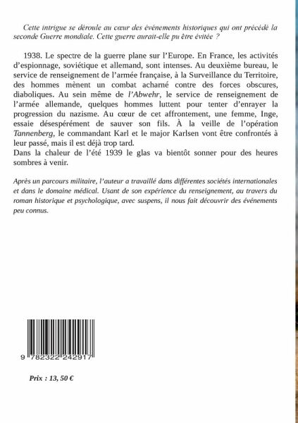 Cette intrigue se déroule au coeur des événements historiques qui ont précédé la Seconde Guerre mondiale. Cette guerre aurait-elle pu être évitée ?1938. Le spectre de la guerre plane sur l'Europe. En France, les activités d'espionnage, soviétique et allemand, sont intenses. Au deuxième bureau, le service de renseignement de l'armée française, à la Surveillance du Territoire, des homme mènent un combat acharné contre des forces obscures, diaboliques. Au sein même de l'Abwehr, le service de renseignement de l'armée allemande, quelques hommes luttent pour tenter d'enrayer la progression du nazisme. Au coeur de cet affrontement, une femme, Inge, essaie désespérément de sauver son fils. À la veille de l'opération Tannenberg, le commandant Karl et le major Karlsen vont être confrontés à leur passé, mais il est déjà trop tard.Dans la chaleur de l'été 1939 le glas va bientôt sonner pour des heures sombres à venir.