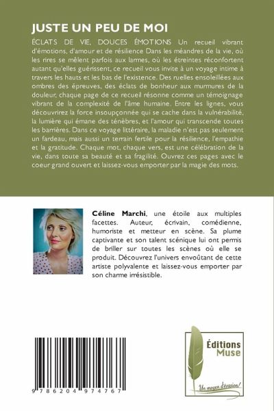 ÉCLATS DE VIE, DOUCES ÉMOTIONS Un recueil vibrant d'émotions, d'amour et de résilience Dans les méandres de la vie, où les rires se mêlent parfois aux larmes, où les étreintes réconfortent autant qu'elles guérissent, ce recueil vous invite à un voyage intime à travers les hauts et les bas de l'existence. Des ruelles ensoleillées aux ombres des épreuves, des éclats de bonheur aux murmures de la douleur, chaque page de ce recueil résonne comme un témoignage vibrant de la complexité de l'âme humaine. Entre les lignes, vous découvrirez la force insoupçonnée qui se cache dans la vulnérabilité, la lumière qui émane des ténèbres, et l'amour qui transcende toutes les barrières. Dans ce voyage littéraire, la maladie n'est pas seulement un fardeau, mais aussi un terrain fertile pour la résilience, l'empathie et la gratitude. Chaque mot, chaque vers, est une célébration de la vie, dans toute sa beauté et sa fragilité. Ouvrez ces pages avec le coeur grand ouvert et laissez-vous emporter par la magie des mots.