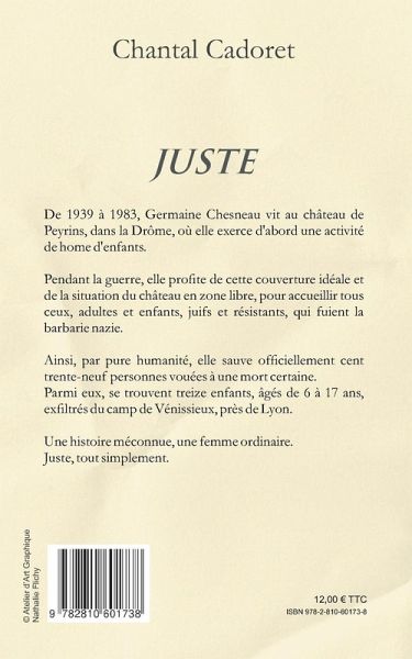 JUSTE est un roman inspiré de faits réels. C'est l'histoire de Germaine Chesneau qui a sauvé 139 personnes dont 13 enfants exfiltrés du camp de Vénissieux, après la rafle de Lyon. Germaine a ouvert son château à tous ceux qui avaient besoin de se protéger de la barbarie nazie sans jamais penser à sa vie ou à sa sécurité. Toutes les anecdotes de ce roman sont vraies mais j'ai pris la liberté de mettre en scène des personnages, presque identiques à ceux qui ont vécu dans ce château, à travers leurs dialogues, et de faire revivre cette femme simple qui a toujours clamé n'avoir fait que son devoir d'être humain et qui a toujours refusé le statut d'héroïne. Elle fut nommée JUSTE PARMI LES NATIONS en 1969.