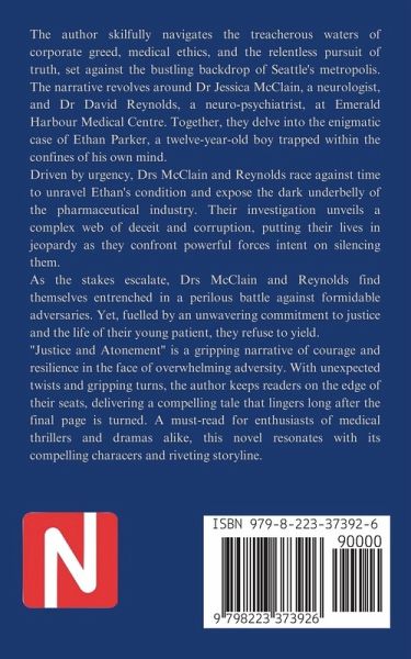 In " Justice and Atonement," author Phoenix Lovegrove delves deep into the murky waters of corporate greed, medical ethics, and the relentless pursuit of truth in the face of adversity. Set against the backdrop of Seattle's bustling metropolis, this gripping medical thriller follows the journey of two doctors: Dr. Jessica McClain, a neurologist, and Dr. David Reynolds, a neuro-psychiatrist, at Emerald Harbour Medical Centre, as they embark on a quest to unravel the mysteries surrounding a puzzling case that defies conventional wisdom. At the centre of this gripping tale is Ethan Parker, a twelve-year-old boy trapped in the labyrinth of his own mind. The narrative unfolds with a sense of urgency as Dr McClain and her team race against time to uncover the truth behind Ethan's condition and expose the nefarious practices of the pharmaceutical industry. Their investigation leads them down a twisted path, uncovering dark secrets and putting their own lives in jeopardy. Jessica and David embark on a journey that takes them into the murky world of pharmaceutical giants and corporate greed. Together, they uncover a web of deceit and corruption that threatens to unravel the very fabric of the medical establishment. As their investigation gains momentum, Jessica and David are thrust into a perilous game of evasion and pursuit with those intent on silencing them. But they refuse to back down, driven by a steadfast determination to uncover the truth at any cost. As the shadows lengthen and the stakes grow higher, they find themselves facing an enemy more formidable than they ever imagined. But with Ethan's life hanging in the balance, they know that failure is not an option. "Justice and Atonement " is a gripping tale of courage, resilience, and the unwavering pursuit of justice. In a world where darkness threatens to engulf everything they hold dear, Jessica and David must summon all of their strength and determination to emerge victorious. Packed with unexpected twists and gripping turns that will leave readers on the edge of their seats, Justice and Atonement " is a must-read for fans of medical thrillers and dramas alike. With its compelling characters and gripping storyline, it's a book that will stay with you long after you've turned the final page.