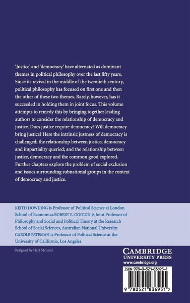 'Justice' and 'democracy' have alternated as dominant themes in political philosophy over the last fifty years. Since its revival in the middle of the twentieth century, political philosophy has focused on first one and then the other of these two themes. Rarely, however, has it succeeded in holding them in joint focus. This volume brings together leading authors who consider the relationship between democracy and justice in a set of specially written chapters. The intrinsic justness of democracy is challenged, the relationship between justice, democracy and impartiality queried and the relationship between justice, democracy and the common good examined. Further chapters explore the problem of social exclusion and issues surrounding sub-national groups in the context of democracy and justice. Authors include Keith Dowding, Richard Arneson, Norman Schofield, Albert Weale, Robert E. Goodin, Jon Elster, David Miller, Phillip Pettit, Julian LeGrand and Russell Hardin.