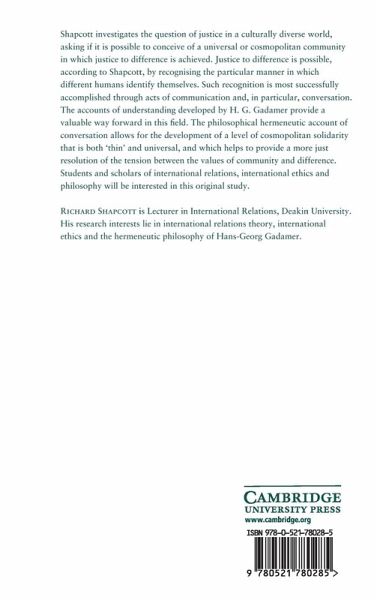 Shapcott investigates the question of justice in a culturally diverse world, asking if it is possible to conceive of a universal or cosmopolitan community in which justice to difference is achieved. Justice to difference is possible, according to Shapcott, by recognising the particular manner in which different humans identify themselves. Such recognition is most successfully accomplished through acts of communication, and in particular, conversation. The accounts of understanding developed by H. G. Gadamer provide a valuable way forward in this field. The philosophical hermeneutic account of conversation allows for the development of a level of cosmopolitan solidarity that is both 'thin' and universal, and which helps to provide a more just resolution of the tension between the values of community and difference. Students and scholars of international relations, international ethics and philosophy will be interested in this original study.