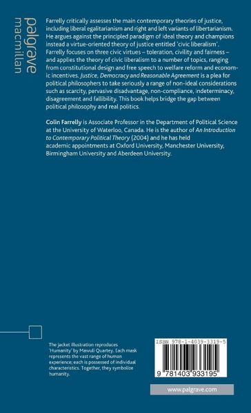 Farrelly argues against the principled paradigm of ideal theory and champions instead a virtue-oriented theory of justice entitled 'civic liberalism'. He critically assesses the main contemporary theories of justice and tackles a number of applied topics, ranging from constitutional design and free speech to welfare reform and economic incentives. "Justice, Democracy and Reasonable Agreement" is a plea for political philosophers to take seriously a range of non-ideal considerations such as scarcity, pervasive disadvantage, non-compliance, indeterminacy, disagreement and fallibility.