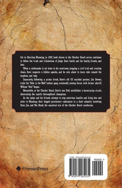 Set in Sheridan, Wyoming, in 1899, book eleven in the Checker Board series continues to follow the trials and tribulations of Judge Dave Smith, and his family, friends, and foes. When a rattlesnake is set loose in his courtroom, stopping a civil trial and creating chaos, Dave suspects a hidden agenda, and he sets about to learn who caused the mayhem, and why. Separately, following a prison break, Dave's old US marshal partner, Jim Bowen, trails the "Hole in the Wall" outlaw gang, eventually joining forces with former sheriff, William "Red" Angus. Meanwhile, at the Checker Board, Dave's son Seth establishes a horseracing circuit, showcasing the ranch's thoroughbred champions. As the judge and his friends attempt to stop notorious bandits and bring law and order to Wyoming, their dogged persistence culminates in a final calamity involving Dave, Jim, and The Black, the ancestral sire of the Checker Board racehorses.