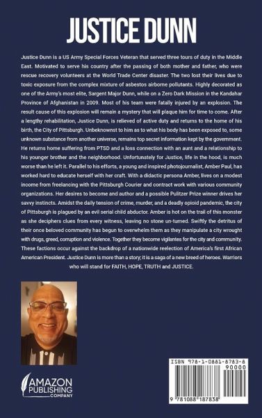 Justice Dunn is a US Army Special Forces Veteran that served three tours of duty in the Middle East. Motivated to serve his country after the passing of both mother and father, who were rescue recovery volunteers at the World Trade Center disaster. The two lost their lives due to toxic exposure from the complex mixture of asbestos airborne pollutants. Highly decorated as one of the Army's most elite, Sargent Major Dunn, while on a Zero Dark Mission in the Kandahar Province of Afghanistan in 2009. Most of his team were fatally injured by an explosion. The result cause of this explosion will remain a mystery that will plaque him for time to come. After a lengthy rehabilitation, Justice Dunn, is relieved of active duty and returns to the home of his birth, the City of Pittsburgh. Unbeknownst to him as to what his body has been exposed to, some unknown substance from another universe, remains top secret information kept by the government. He returns home suffering from PTSD and a loss connection with an aunt and a relationship to his younger brother and the neighborhood. Unfortunately for Justice, life in the hood, is much worse than he left it. Parallel to his efforts, a young and inspired photojournalist, Amber Paul, has worked hard to educate herself with her craft. With a didactic persona Amber, lives on a modest income from freelancing with the Pittsburgh Courier and contract work with various community organizations. Her desires to become and author and a possible Pulitzer Prize winner drives her savvy instincts. Amidst the daily tension of crime, murder, and a deadly opioid pandemic, the city of Pittsburgh is plagued by an evil serial child abductor. Amber is hot on the trail of this monster as she deciphers clues from every witness, leaving no stone un-turned. Swiftly the detritus of their once beloved community has begun to overwhelm them as they manipulate a city wrought with drugs, greed, corruption and violence. Together they become vigilantes for the city and community. These factions occur against the backdrop of a nationwide reelection of America's first African American President. Justice Dunn is more than a story; it is a saga of a new breed of heroes. Warriors who will stand for FAITH, HOPE, TRUTH and JUSTICE. The intensity of Justice Dunn is the core of this fiction thriller. It is packed with action from page one. The Writer fills each scenario with a climatic element that keeps the reader engaged. The superhero aspect lends brilliantly to the audacity of hope. The urban reporter, the story's heroine, gives it morality and pride to professionalism. The detritus caused by the antagonist in this urban battle of good versus evil, will leave the readers anxious for TRUTH, HOPE, FAITH and JUSTICE.