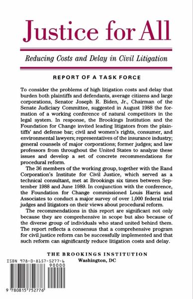 " To consider the problems of high litigation costs and delay that burden both plaintiffs and defendants, average citizens and large corporations, Senator Joseph R. Biden, Jr., Chairman of the Senate Judiciary Committee, suggested in August 1988 the formation of a working conference of natural competitors in the legal system. In response, the Brookings Institution and the Foundation for Change invited leading litigators from the plaintiffs' and defense bar; civil and women's rights, consumer, and environmental lawyers; representatives of the insurance industry; general counsels of major corporations; former judges; and law professors from throughout the United States to analyze these issues and develop a set of concrete recommendations for procedural reform. The 36 members of the working group, together with the Rand Corporation's Institute for Civil Justice, which served as a technical consultant, met at Brookings six times between September 1988 and June 1989. In conjunction with the conference, the Foundation for Change commissioned Louis Harris and Associates to conduct a major survey of over 1,000 federal trial judges and litigators on their views about procedural reform. The recommendations in this report are significant not only because they are comprehensive in scope but also because of the diverse group of individuals who stand united behind them. The report reflects a consensus that a comprehensive program for civil justice reform can be successfully implemented and that such reform can significantly reduce litigation costs and delay."