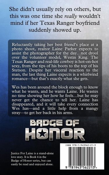 Reluctantly taking her best friend's place at a photo shoot, realtor Laine Parker expects to assist the photographer for the day...not drool over the volunteer model, Westin King. The Texas Ranger and real-life cowboy is hot-on-hot sexy, from the tips of his boots to the top of his Stetson. Despite her visceral reaction to the man, the last thing Laine expects is a whirlwind romance-but that's exactly what she gets. Wes has been around the block enough to know what he wants, and he wants Laine. He wastes no time showing her how he feels...but he may never get the chance to tell her. Laine has disappeared, and it will take every connection Wes has-and a little help from a mangy stray-to get her back in his arms. * Justice for Laine is book 4 in the Badge of Honor: Texas Heroes series. Each book is a stand-alone, with no cliffhanger endings.